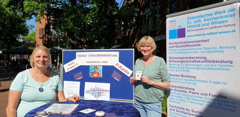 Zum Beispiel in Form einer Präventionsaktion auf dem Wochenmarkt Buchholz. Es wurde über die über die Soziale Schuldenberatung informiert und außerdem explizit die Möglichkeit gegeben über das P-Konto zu sprechen und sich über Möglichkeiten und Bedingungen zu informieren. .